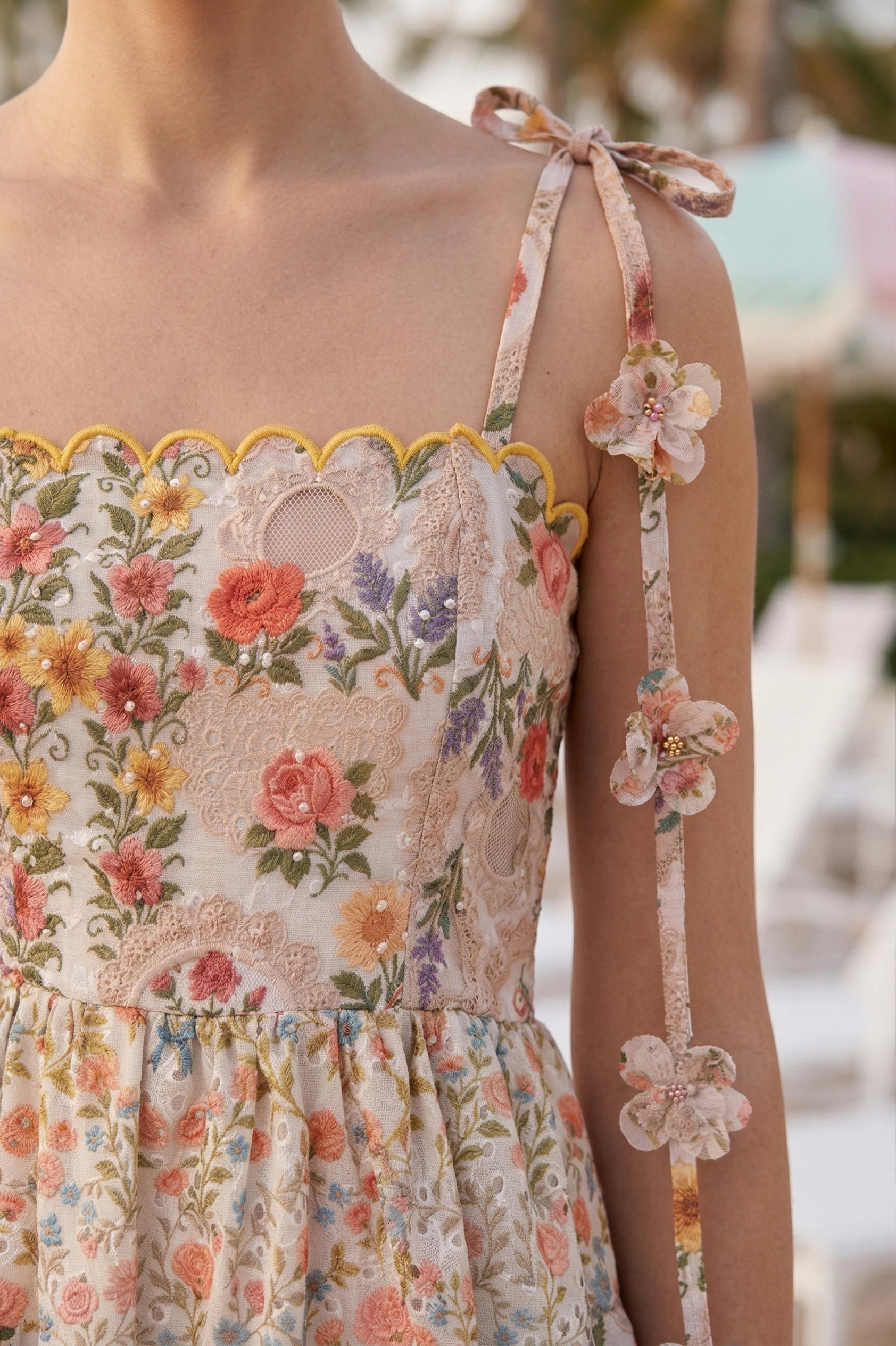 The Tapestry Mini Dress is a timeless piece crafted from a delicate blend of printed eyelet fabric with an embroidered effect. Designed to highlight femininity with a romantic and sophisticated air, its handcrafted construction incorporates laser cut-shaped embroidery at the neckline and a combination of fabrics and textures for a unique harmony. Its straight neckline features laser-cut blackberry motifs. The bodice is fitted, while the flowing, layered skirt combines prints that flatter the figure. This short dress is designed in three tiers, combining printed fabric with adjustable straps and laser-cut flowers with decorative embroidery. The A-line skirt flows naturally, highlighted by the eyelet fabric with a print designed to create a fully embroidered effect, adding depth and texture. The back features a straight neckline with the same laser cut motif, and the textured fabric adds a very special touch. Ideal for celebrating special moments or gifting a cherished keepsake, the Tapestry dress is more than just a dress: it's a statement of the soul, embroidered thread by thread. Lightweight, breathable, and fully lined, it elegantly flatters any figure, highlighting the unique ROSAPISTACHO embroidery. ✨ Perfect for any occasion: From formal events to casual get-togethers, this dress is the ideal blend of comfort and sophistication. The model is wearing a size S.